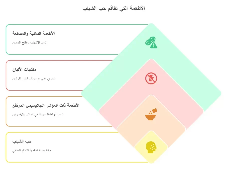 يمكن أن يؤدي الالتهاب الناجم عن بعض الأطعمة إلى تفاقم حب الشباب عن طريق تعزيز انسداد المسام ونمو البكتيريا.