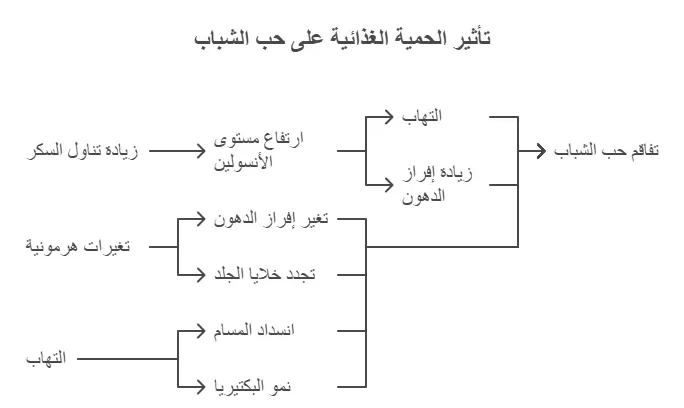 حب الشباب هو حالة جلدية معقدة تتأثر بعدة عوامل، منها الجينات والهرمونات والبكتيريا والالتهابات. يلعب النظام الغذائي دورًا مهمًا في تفاقم حب الشباب أو المساعدة في علاجه من خلال تأثيره على الالتهابات ومستويات الهرمونات وإنتاج الدهون في الجلد.